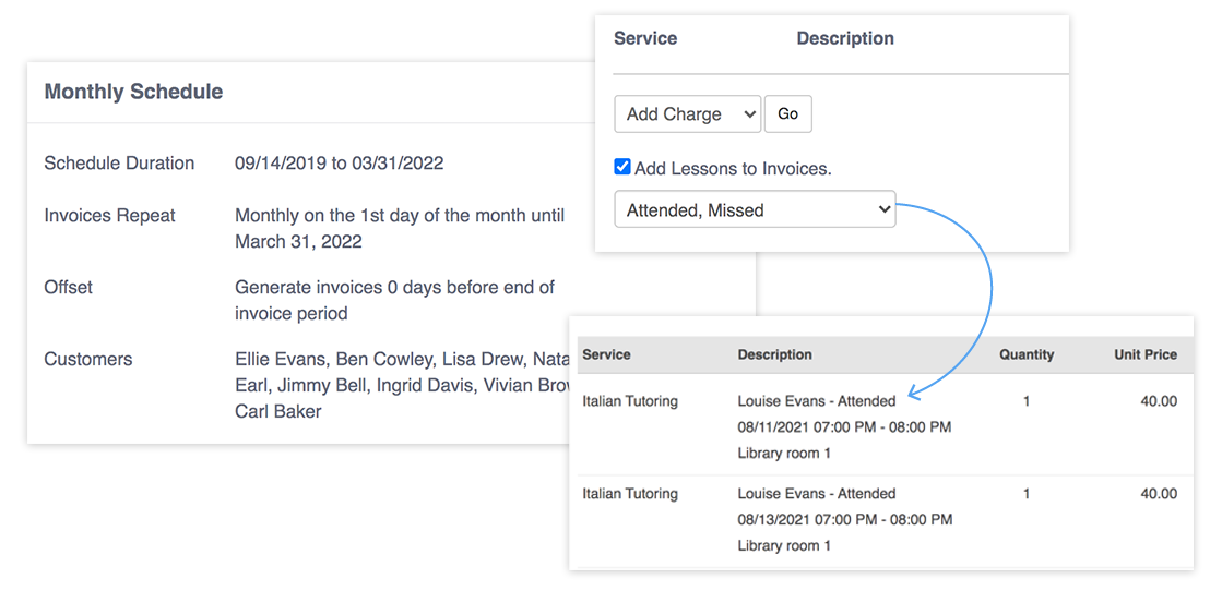 Hourly Billing: Lesson costs are calculated using the Service List, or a cost is set on the student’s profile.